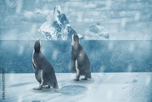 Penguin In The Snow And Ice Storm With Iceberg Buy This