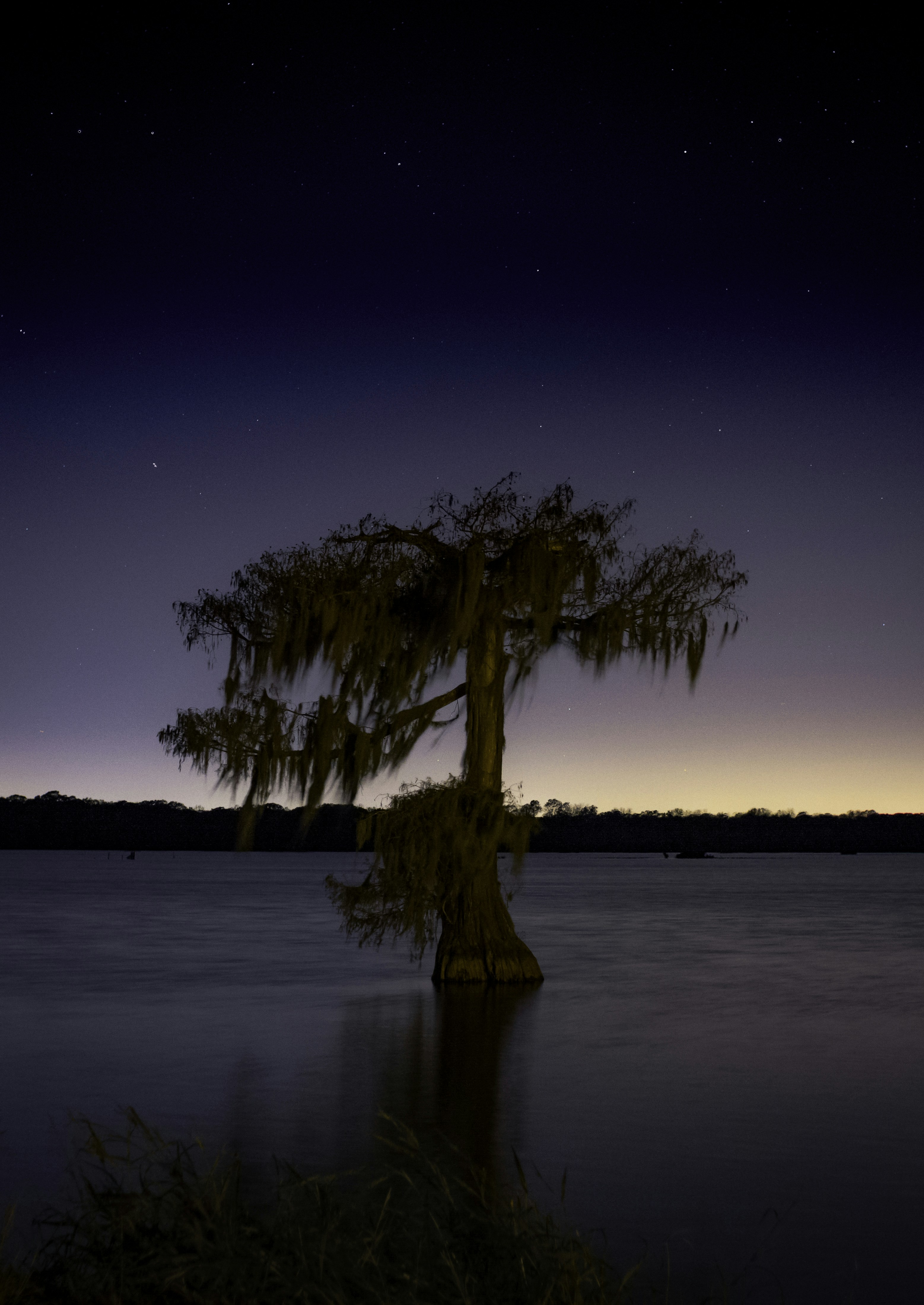Tree Near Lake At Night Landscape Photography Canvas Print Blue