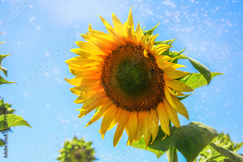 Sunflowers Field Focus First Cloudy Blue Sky Organic Natural