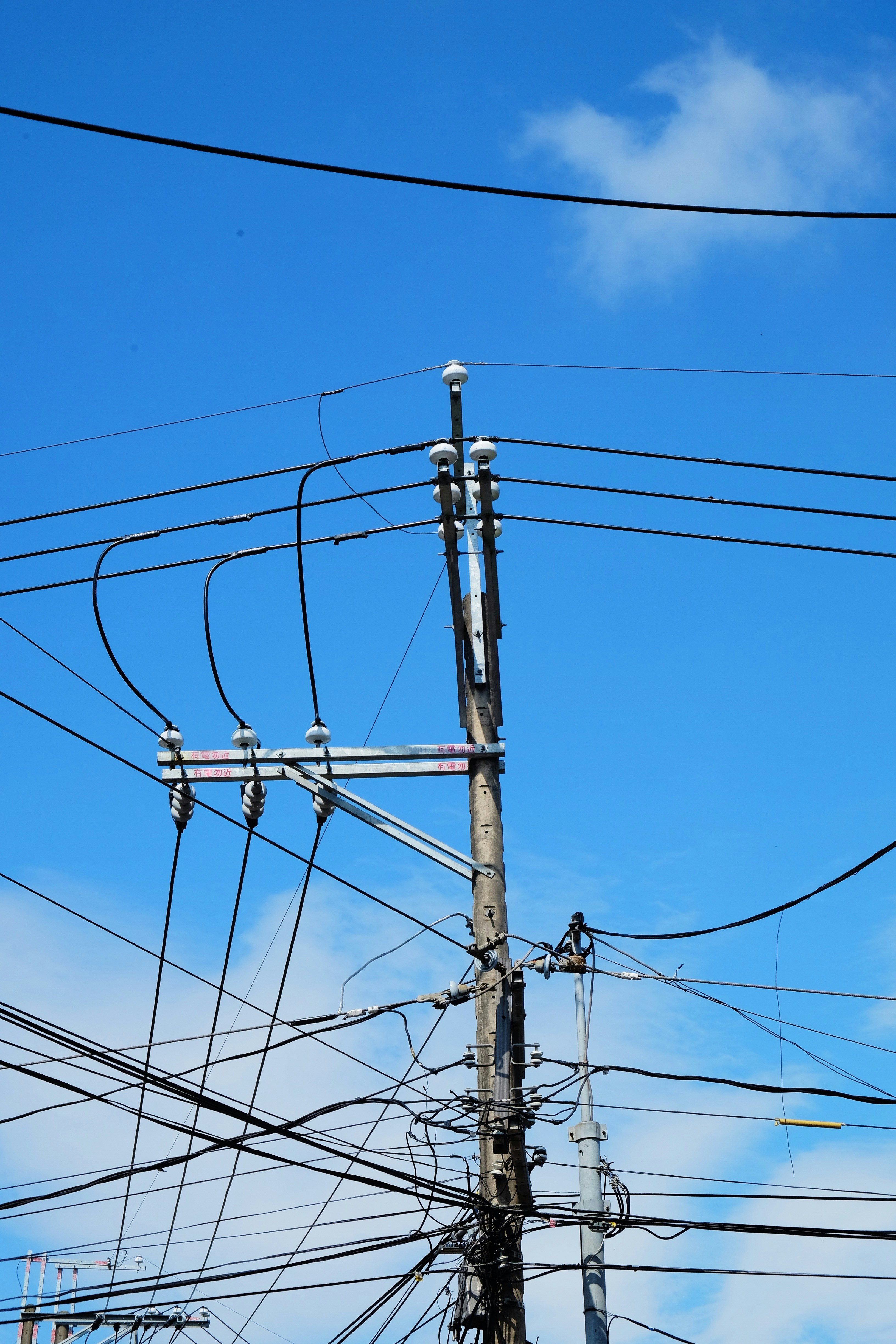 Utility Pole Against Blue Sky Supporting Overhead Power Lines