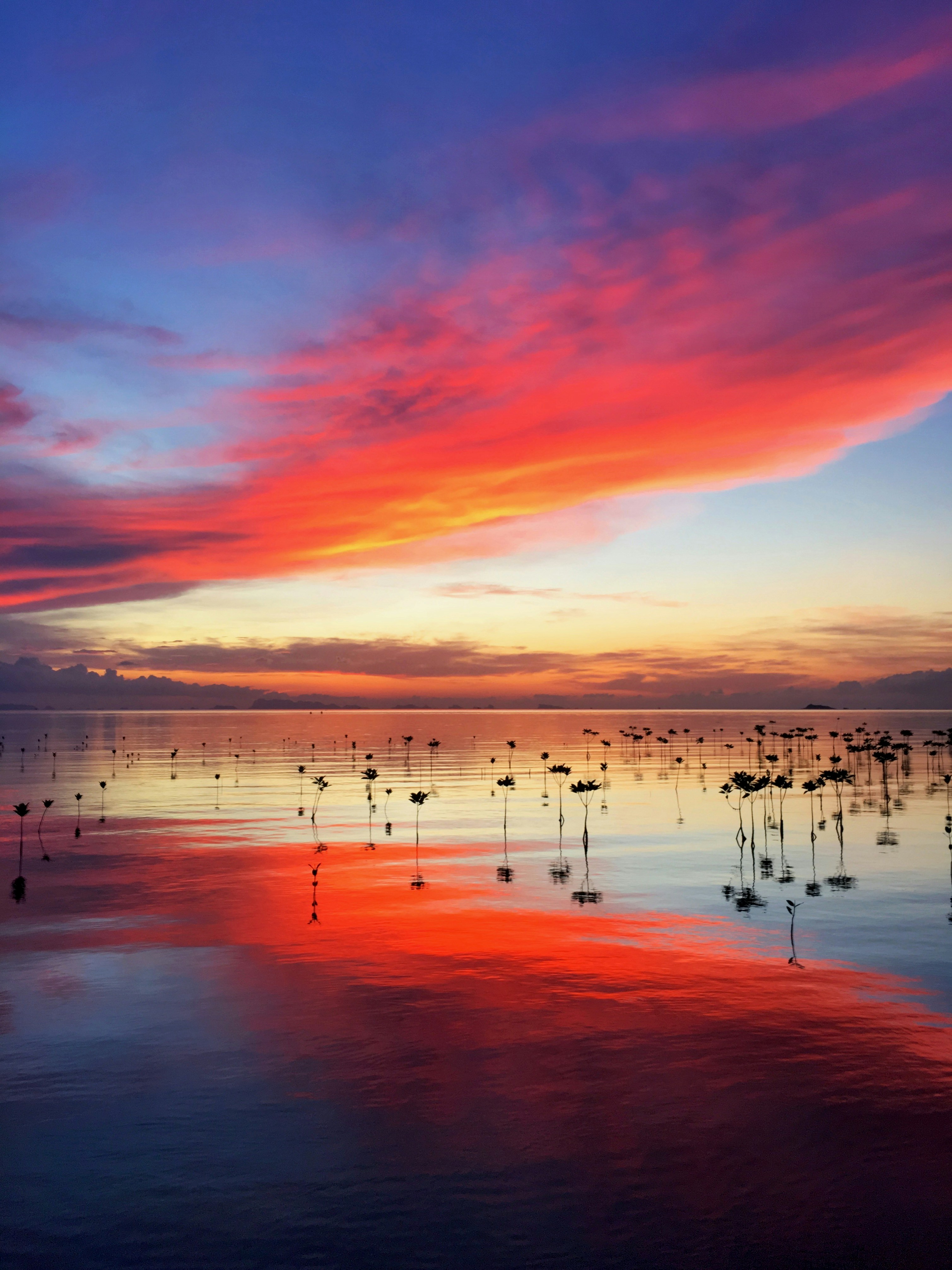 Amazing Sunset Reflection Clouds Red Tree Lake Sea