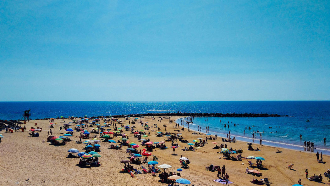 Beach People Parasol Deck Chairs Walking Swimming