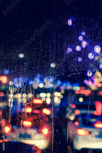 Rain Drops Falling Down On Glass With Multi Color City Car Traffic Bokeh Light Background Water Droplets On Window Glass Or Car Glass