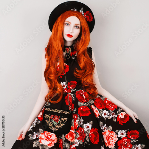 Young Redhead Girl With Very Long Wavy Hair In A Dress With
