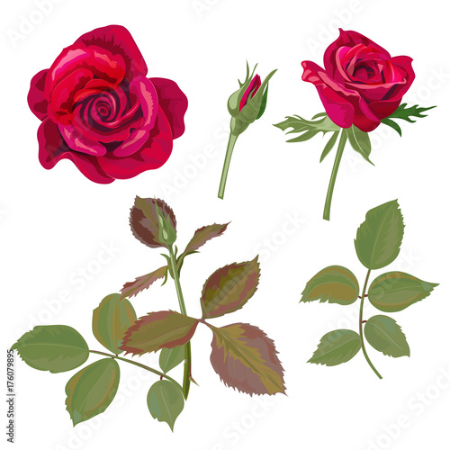 Set Of Roses Red Flowers And Buds Green Leaves On White