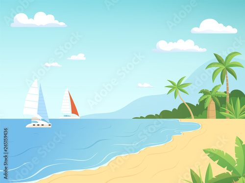 Seaside Landscape Summer Beach With Palm Trees Sailboats