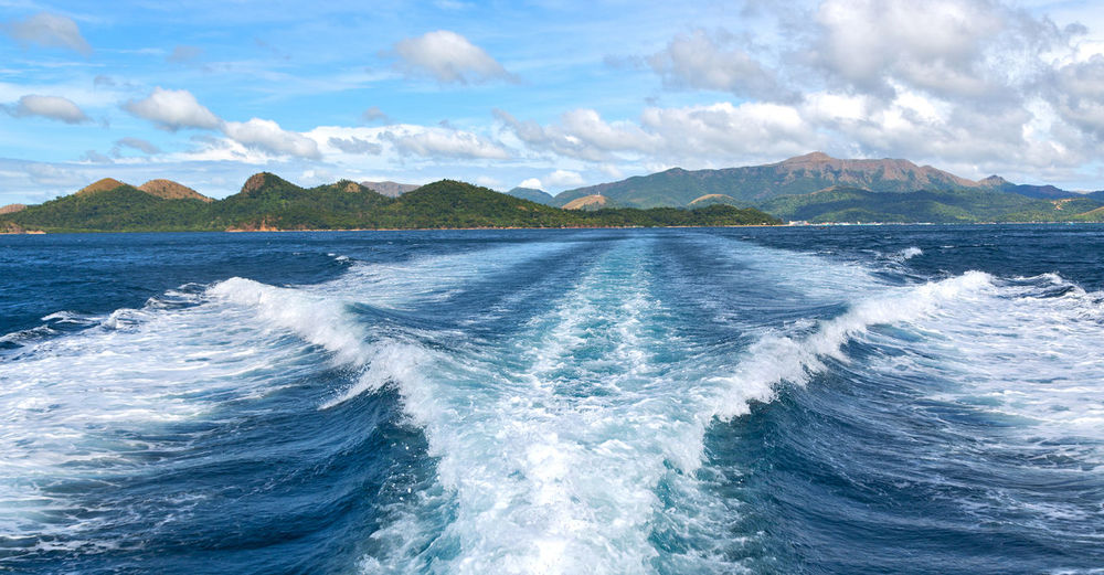 Ship Water Sea Waves Clouds Horizon Hill Wallpapers Hd