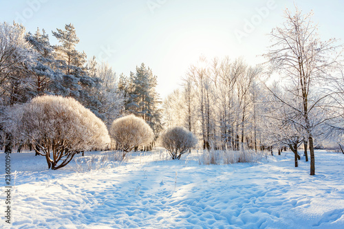Frosty Trees In Snowy Forest Cold Weather In Sunny Morning