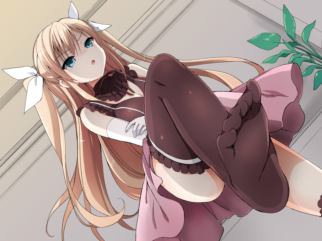 1girl Ahoge Albino Black Legwear Blush Elbow Gloves Gloves