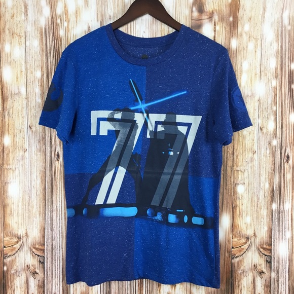 Star wars tie fighter 77 mens blue t shirt large rogue one size large nwt see more like this sponsored star wars. Free shipping on orders over 25 shipped by amazon. Made from 100 cotton our star wars distressed 77 mens t shirt features distressed silver lettering spelling out star wars while identifying its debut date 1977. Its certainly worth a mention on the occasional t shirt.