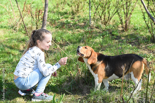 Little Girl Train Dog On Summer Nature Child Play With Pet