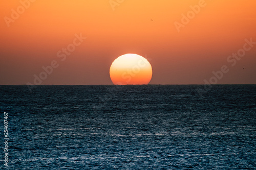 Sunset Or Sunrise Moment Over The Ocean With Sun Touching