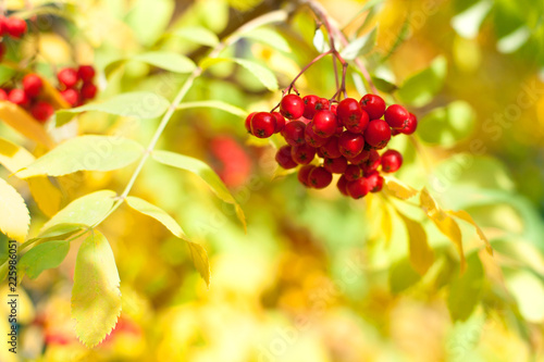 Bunch Of Red Rowan Berries On Yellow And Green Autumn Leaves