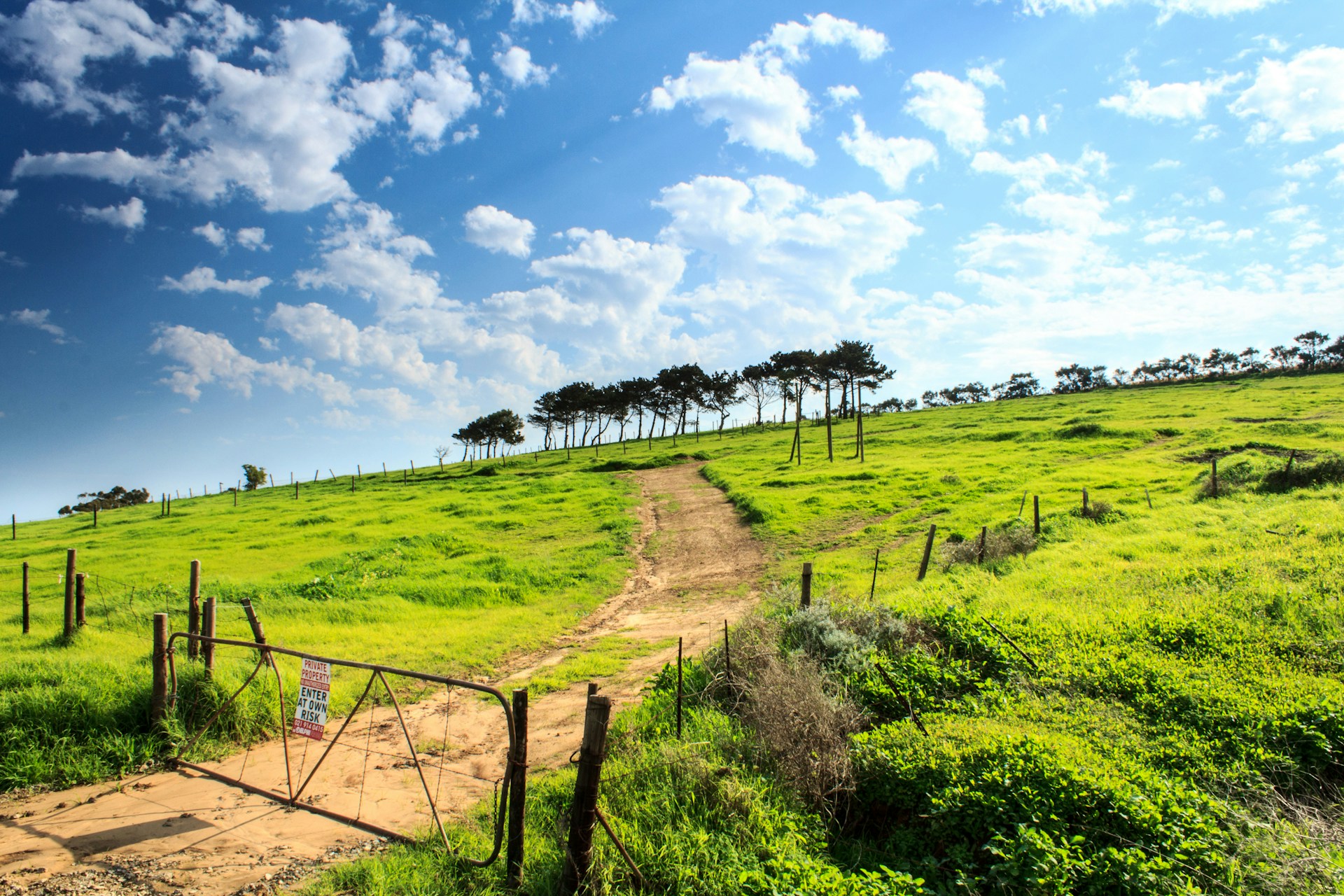 View Dirt Road Lined Trees Gate Stock Photo Edit Now
