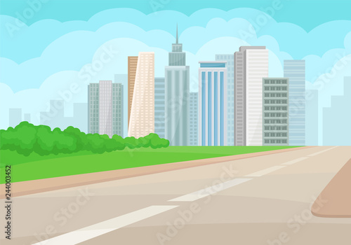 Urban Landscape With Road High Rise Buildings Green Grass