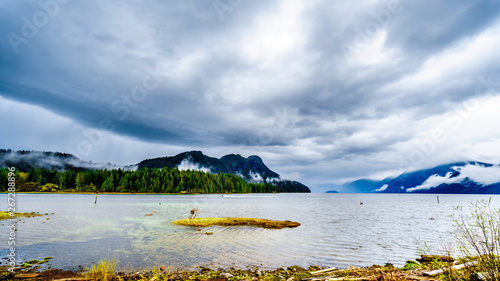 Oil Slick On Pitt Lake Under A Dark Cloudy Sky With Rain