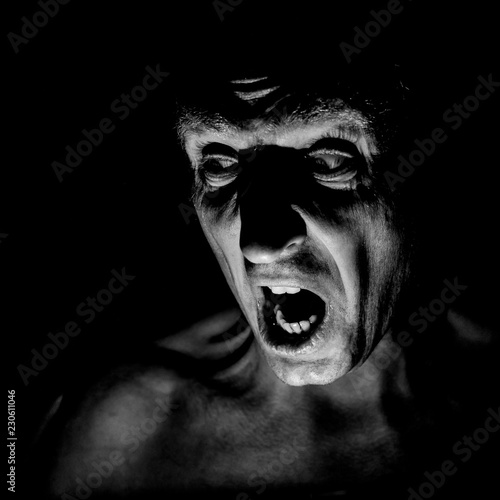 Closeup Portrait Of Angry Man Screaming In Darkroom High Res