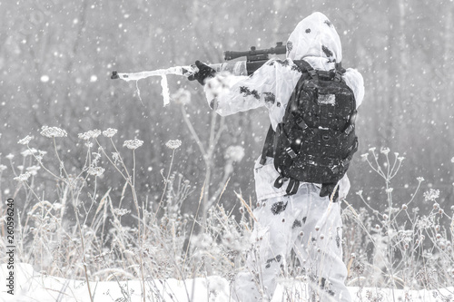 Soldier In White Camouflage Aiming With Sniper Rifle At Winter