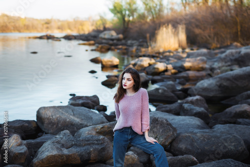 Pictures A River Bank Beautiful Girl Sitting River Bank
