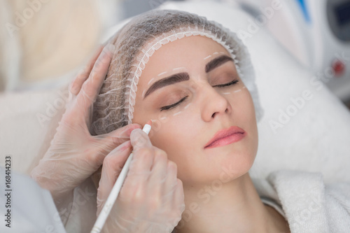 Plastic Surgery Concept Hands In Gloves Marking Women Face