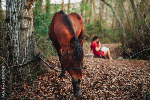 Beautiful Women Sitting In Forest And Reading Book Stock
