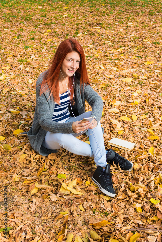 Fotografie Obraz Smiling Redhead Girl Relaxing On Fall