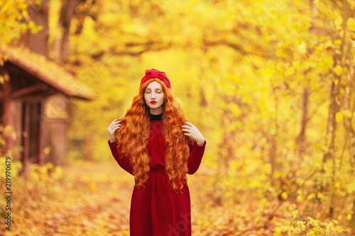Redhead Woman In Red Coat On Picturesque Autumn Background