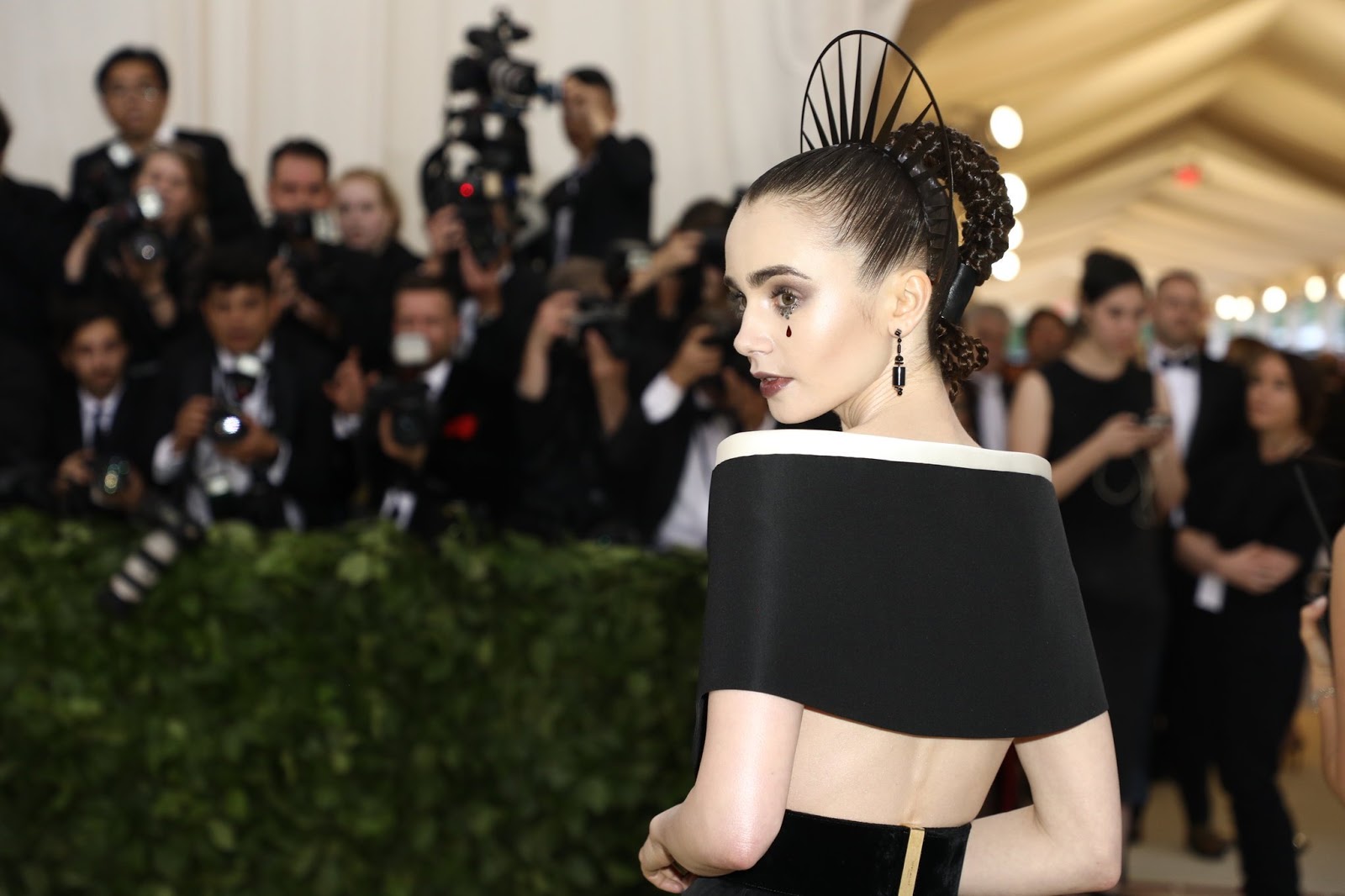 Women Lily Collins Brunette Model Necklace Black Dress