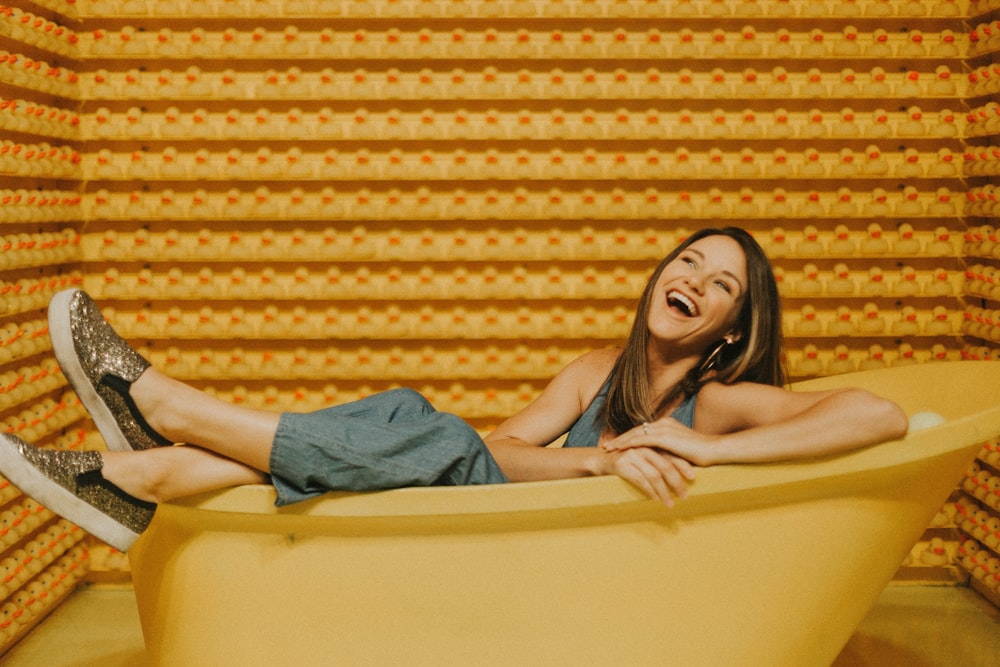 Woman Young Couch Sitting Looking Into Camera Smile