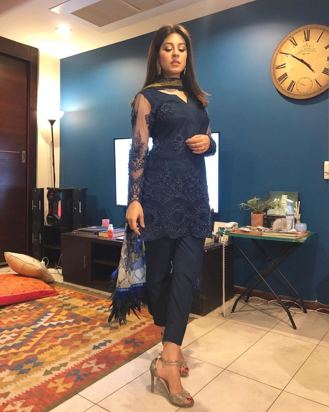 Pregnant Woman In Blue Dress Posing In Front Of Big Clock