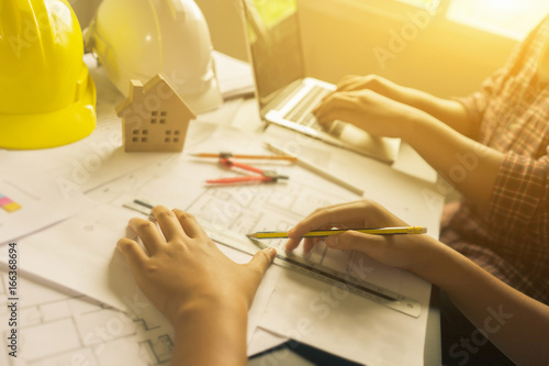 Architect Man Working With Laptop And Blueprints Sketching A